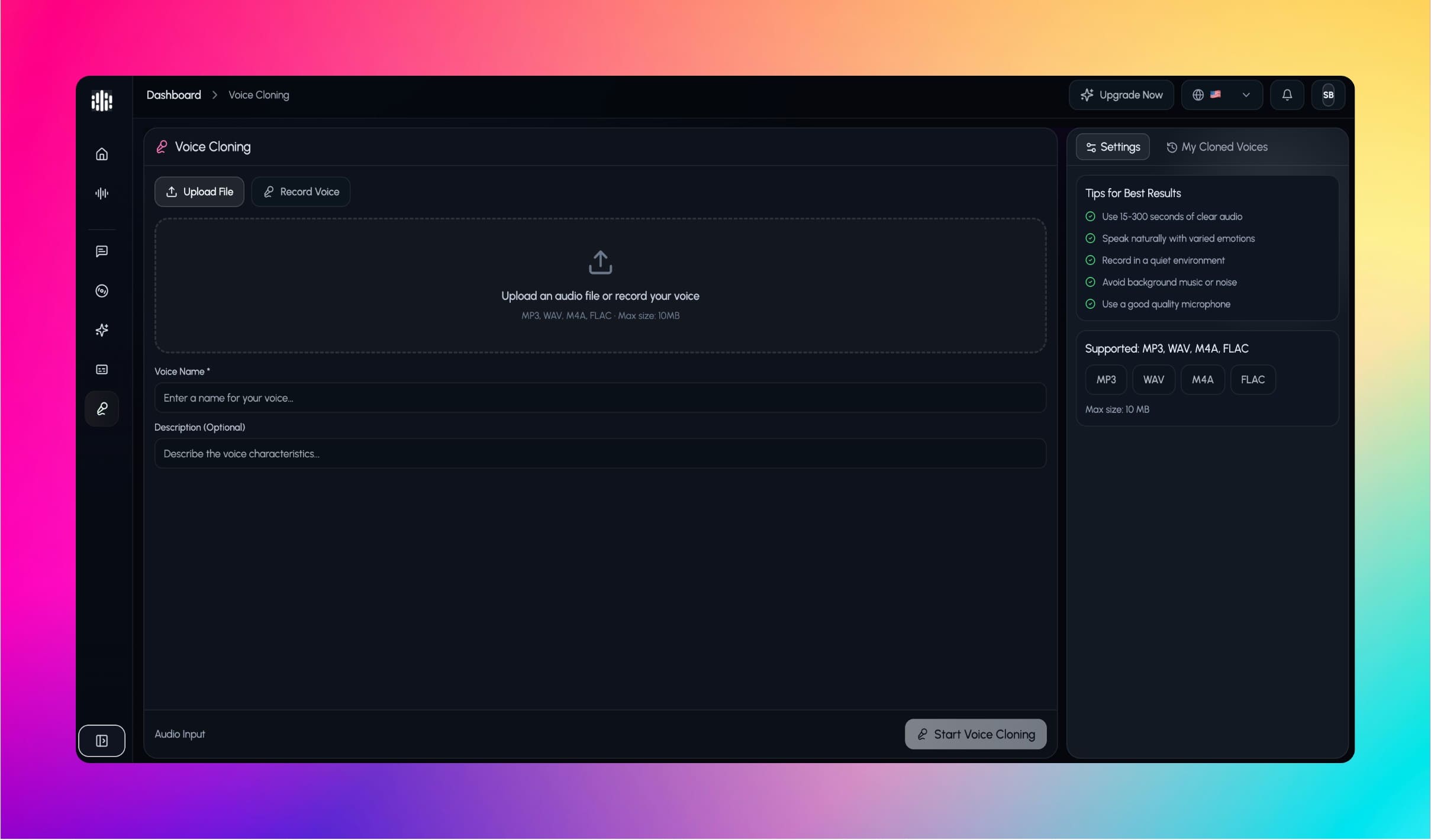 Para mejores resultados, usa 30–120 segundos de voz clara. La calidad importa más que la duración.