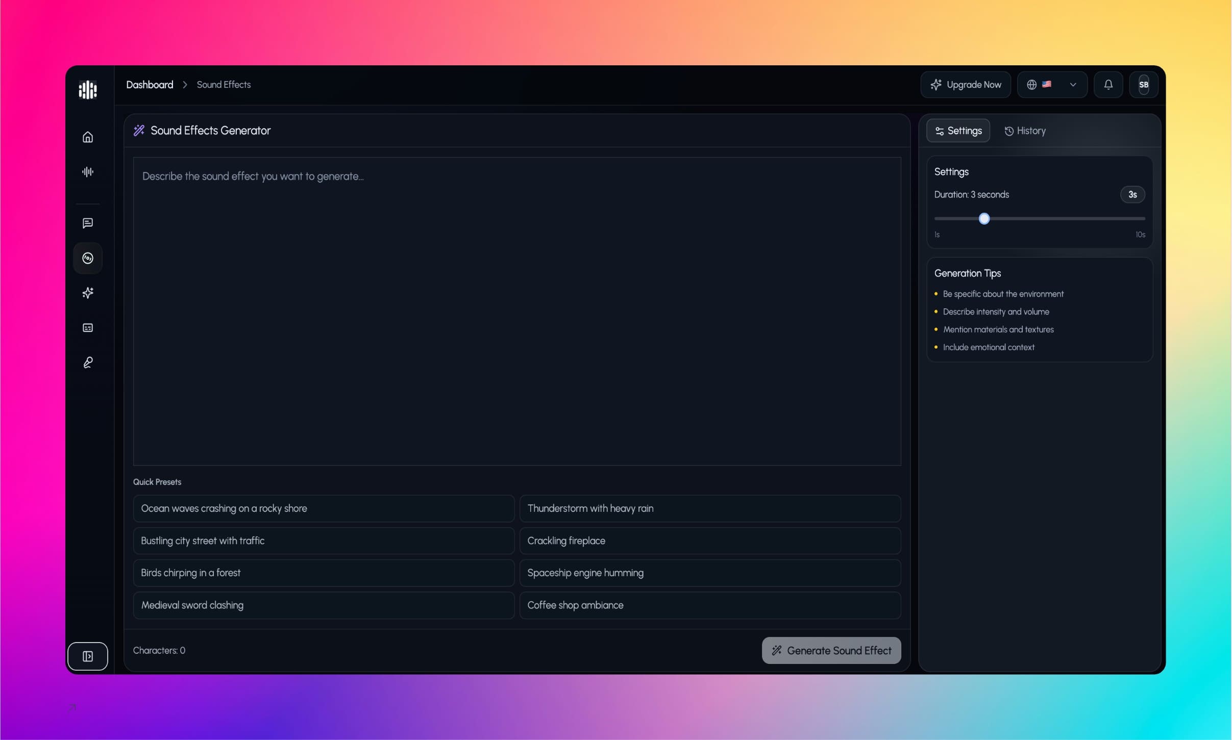 Generate sound effects with a sound effect generator. Write a prompt, choose duration, and download MP3 audio from your dashboard.