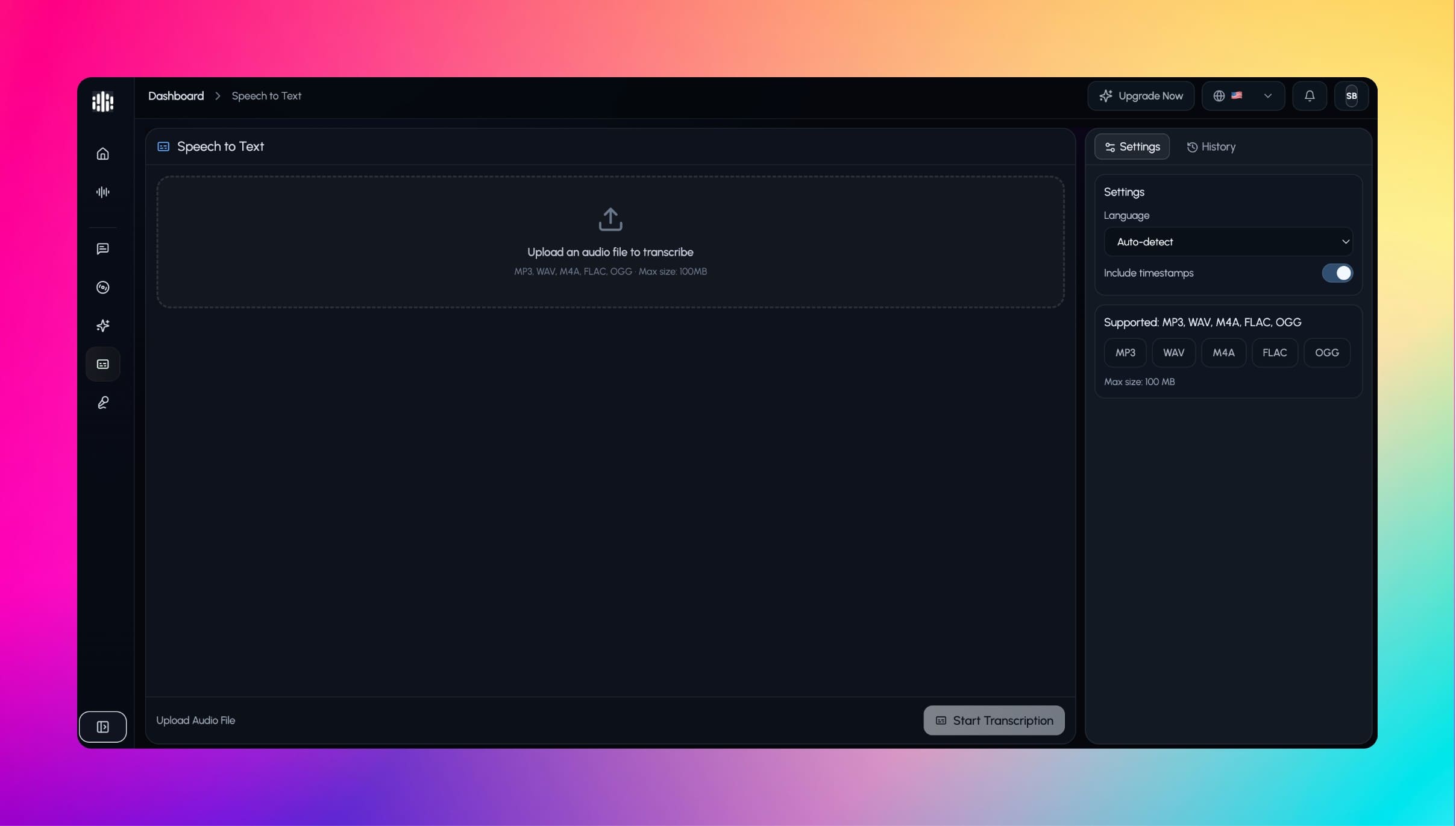 Upload common audio formats and start transcription.